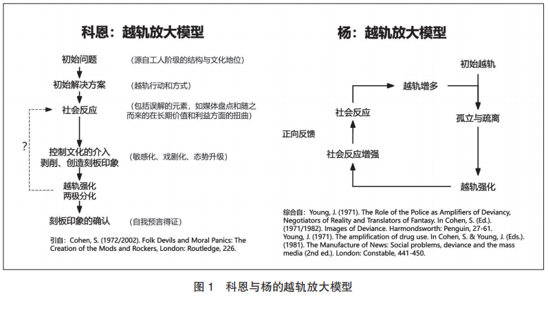 科恩和杨的理论源流同中存异,细读二者研究还可以发现,即便从同一理论出发两人也会得出不同的结论。科恩和杨同样借鉴了威尔金斯(Leslie Wilkins)提出的“越轨放大螺旋”(deviancy amplification spiral)并建立了相应的解释模型(见图1),但两人对威尔金斯的理论态度及各自建立的模型均有差异,其根本原因在于两人的研究重点不同。杨试图把在美国学界相对独立的标签理论和亚文化理论相结合,前者侧重解释社会反应,后者侧重解释社会和越轨者的行为(Young,2011)。借用威尔金斯的理论,杨阐明了媒体报道让越轨者得以了解其他越轨者的观念和行为,社会的孤立与疏离反而帮助他们建构了自己的另类社群认同,其新行为会激起更强的社会反应并陷入恶性循环(Young,1974,1971)(见图1右)。科恩同样延续了马茨阿(1969:24,25)“超越矫正的立场,回归社会情境评估越轨行为”的观念,但他更关心的是社会反应的本质而非杨关心的社会反应如何影响社会行为,因此在科恩的讨论中社会行为只是作为背景性问题(Cohen,1972/2002:8,19)。在《民间恶魔与道德恐慌》第三版序中,科恩承认“这本书最薄弱之处在于道德恐慌与民间恶魔之间的联系”(Cohen,2002:xxix),威尔金斯的理论虽然提供了一种潜在联系,但科恩反思认为越轨放大但不一定会陷入“螺旋”(因此科恩采用了直线形模型而非环形模型),并质疑威尔金斯这一从控制论出发的模型显得过于机械(Cohen,2011)。在科恩与杨之后,道德恐慌理论得到了长足发展,尽管后世对他们的模型有不少批评,但不可否认两人在该领域所做出的开创性贡献。