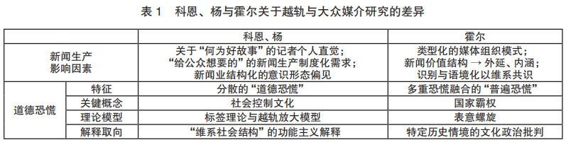 事实上,霍尔等CCCS成员并非要延续符号互动论的微观社会学视角,而是尝试跳出科恩等人将道德恐慌视作“维系社会结构的必要手段”的潜在功能主义倾向,从宏观结构性视角探究道德恐慌的政治社会根源与意识形态功能(两人比较见表1),葛兰西的政治理论成为他们政治批判的关键抓手。进入CCCS后,霍尔在同事科蒂(Lidia Curti)的介绍下深入了解到葛兰西的理论(Hay,Hall & Grossberg,2013),他们在《管控危机》中以“国家”替代科恩、杨提到的“社会控制文化”来引入葛兰西的霸权理论(Hall et al.,1978:194-195),强调道德恐慌并非社会控制文化下任何历史时期都可能爆发的集体非理性,而是20世纪70年代英国特定历史与政治环境下的产物(Hunt,1997)。不同于越轨放大模型对单个道德恐慌现象的分散解读,霍尔等人提出的“表意螺旋”(signification spiral)将20世纪60年代以来多个道德恐慌序列视作叠加融合的整体,包括媒体在内的不同主体通过话语将越轨行为带来的威胁推向更高的临界值,从而合法化对其采用升级的控制手段(Hall et al.,1978:222-223,226)。这一融合序列本质上是英国社会总危机的表征,它反映了英国社会资本主义体系内部积累的矛盾,以及战后福利国家政策下共识政治的瓦解并向强制性政治和威权民粹主义转变的国家文化霸权危机(Hall,1985),制造道德恐慌则是转嫁危机、维系共识、重塑霸权的手段之一。