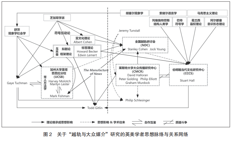 在勾勒英美媒介社会学“黄金时代”图景的《回到未来?》一文中,裘伯似乎始终在回应一个质疑的声音,即为何在数字时代重温先前的媒介社会学经典:“社会学的经典贡献一直是批判性地审视现有的结构和实践,它至今仍可为研究新闻实践及其所处的复杂结构提供方法论和不断更新的理论框架,就像20世纪70年代那样。”(Tumber,2014)本文以越轨与大众媒介这一学术史个案切入,系统梳理了英美学者以社会学为主要视角开启的知识生产与对话网络(见图2),这些成果除了为理解那段动荡不安的历史留下了一面透镜外,也成为社会学与其他学科理论交织融通的关键节点。以此个案串联起的黄金时代的另类叙事,不止是扭转以美国研究为中心的主导叙事的一次尝试,更指向对空间叙事逻辑的偏重及其与内外主义解释取向的结合,从而试图为遥远抑或临近的学术地图解读提供超越个案的借鉴意义。