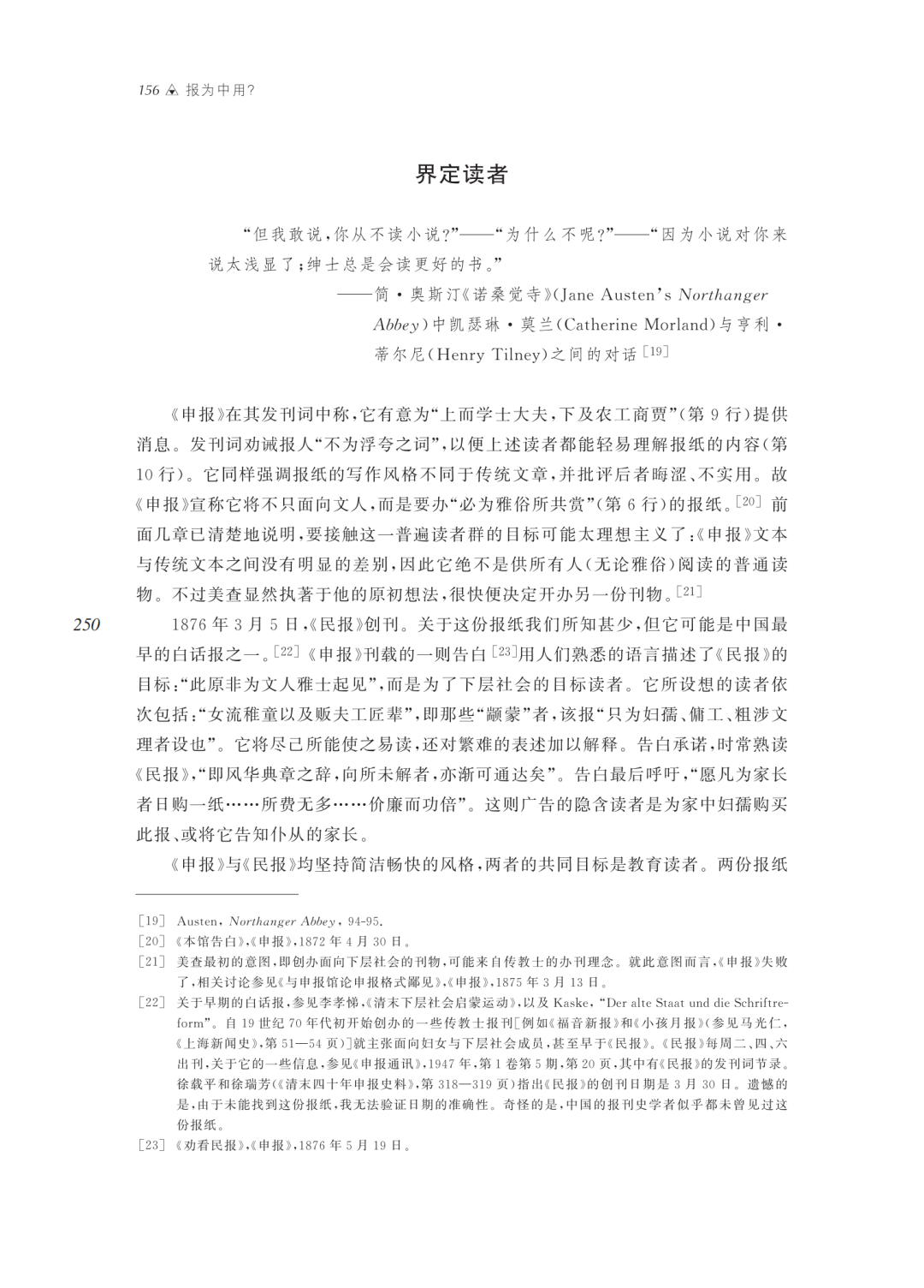 《报为中用?——上海新闻媒体的影响力、定位与变革(1872—1912)》聚焦晚清上海的新式报刊《申报》,细致展示了它如何通过借用传统体裁、引述圣人之言以及转载京报等方式,最终成为一份中国的报纸。本书表明早期中文新报并非一种尚未“成熟”的媒体,而是在跨文化情境中形成的一种创造性成果;亦考察了报刊在推动社会与观念变革、塑造并展示特定身份认同与中国民族主义方面的影响力,这种影响力深植于、且恰恰来源于人们心目之中。