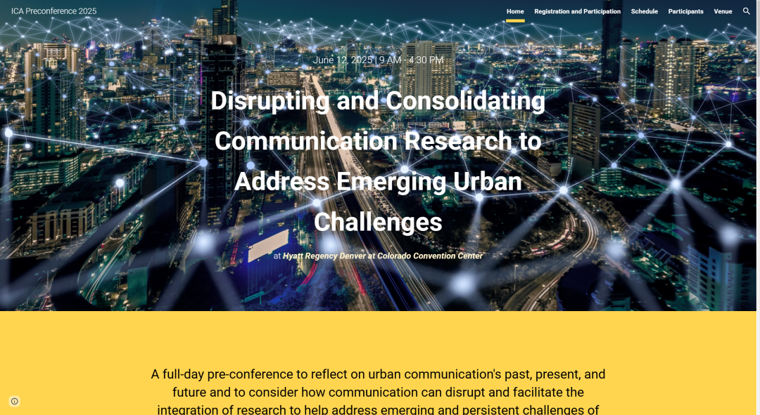2025年6月12日,由复旦大学信息与传播研究中心、浙江大学数字沟通研究中心、伦敦政经学院、罗格斯大学、丹佛大学、密歇根大学、城市传播基金会联合主办的ICA(国际传播学会)会前会——“Disrupting and Consolidating Communication Research to Address Emerging Urban Challenges(回应城市的新挑战:传播研究的重构与融合)”在美国科罗拉多州丹佛举行。中心学术团队成员潘霁教授、李梦颖青年副研究员参加了会议并作学术报告。本次会议,是中心继2024年与新加坡国立大学联合主办“智能传播与城市网络”国际学术会议后,再次主办“城市传播”方向的ICA会前会,旨在为全球城市传播领域的学者搭建学术交流平台,推动跨学科、跨区域的研究合作与创新。