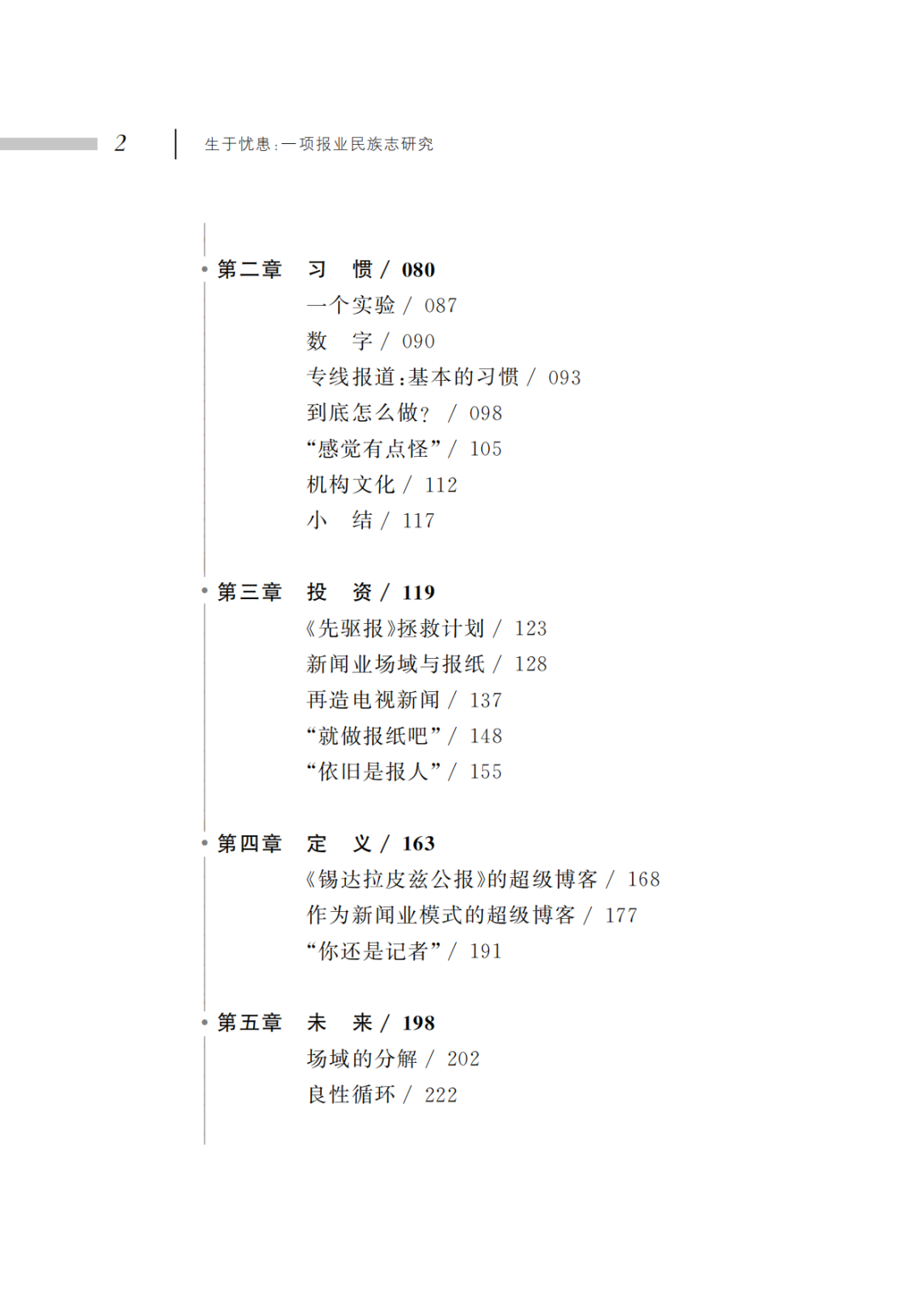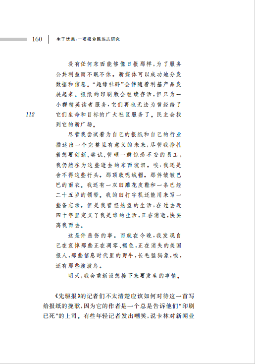戴维·莱夫认为,记者不能或者不愿意实施创新的原因有很多:部分因为他们的习惯,所谓积习难改;部分出于策略性的计算——他们发现变革的成本远远超过了它的收益;还有一部分,因为尽管他们希求变革,但新闻业的基本定义与目标仍然使其无法摆脱与传统的捆绑。就这样,新闻业不再是一个完整的社会场域,开始逐步分解;以后还会出现更多类型的新闻生产实践,但新闻业或许再也不会是一种能与其他实践相分离的独立活动了。有一件事是确定无疑的:不论接下来发生什么,这些变化都会对新闻业在社会中所扮演的角色产生巨大影响,或许还将彻底改变其内涵与目标。对所有关心新闻业与社会之未来的读者而言,《生于忧患:一项报业民族志研究》是一本令人兴奋的必读书。